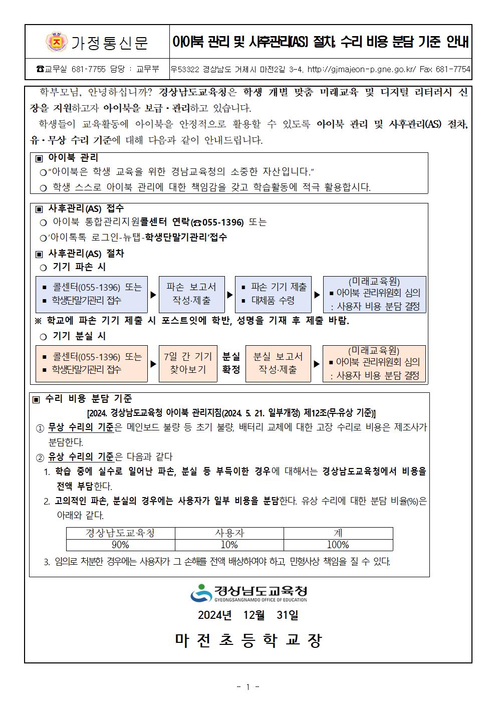 가정통신문-아이북 관리 및 사후관리(AS) 절차, 수리 비용 분담 기준 안내.hwp