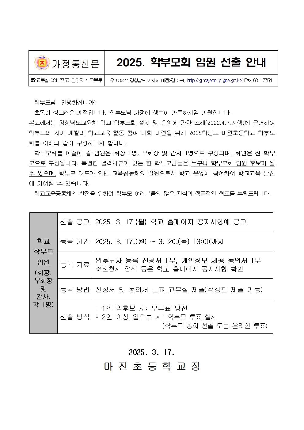 2025학년도 학부모회 임원 선출 가정통신문